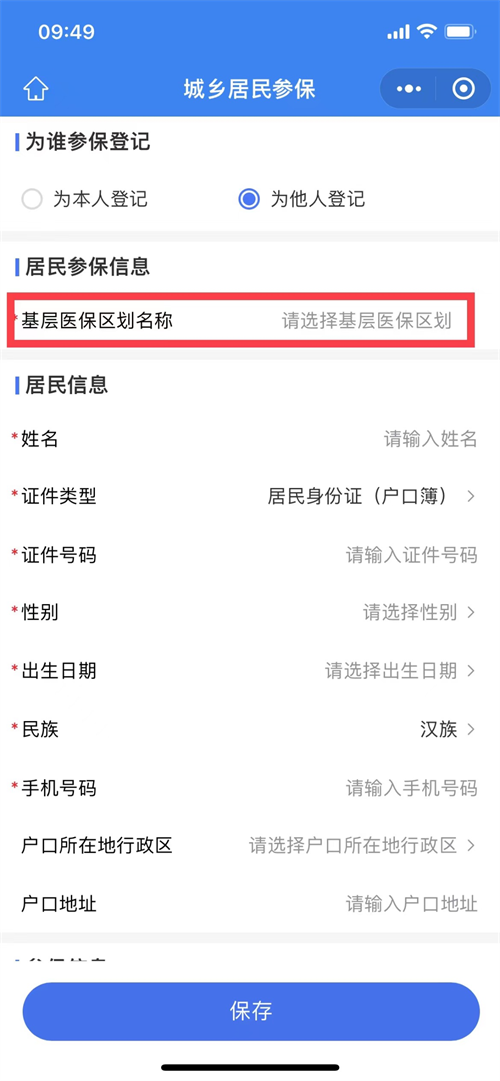 2.按要求填写基本信息(带*项为必填项),点击【基层医保区划名称】,地点切换成参保地县、区,【搜索栏】填入乡镇或街道名称,如户籍在“清濛”,填写“清濛”并点击【搜索】,下拉框选定户籍所在社区/村,完成居民信息填写并上传户口簿91成人、户主页和参保人页后保存即可。